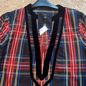 J Crew Velvet Trimmed V Neck Tunic Black red Tartan long sleeve blouse top XS