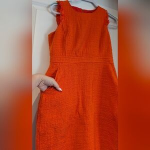 Sleeveless midi tweed dress in bright orange. Perfect for fall. Versatile, office wear, business casual. It has pockets!