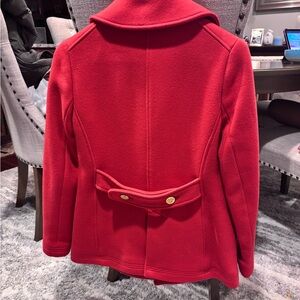 Chic and warm J. Crew pea coat. Features bold red color and elegant gold buttons. Ideal for stylish outings.
