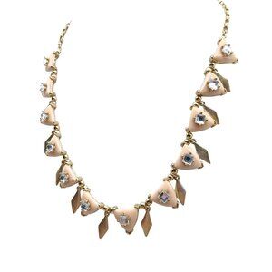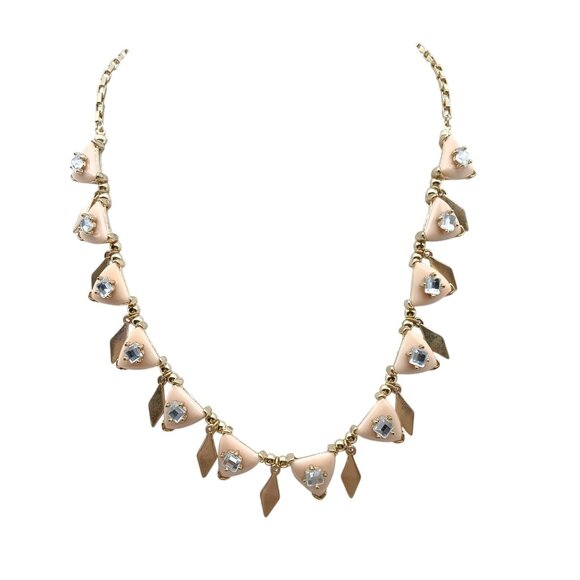 This charming necklace by J Crew evokes the elegance of bygone eras with its pink enamel triangles and sparkling rhinestone accents. Each piece is beautifully detailed, giving it an antique feel that is both timeless and chic. Ideal for adding a touch of vintage glamour to your ensemble.