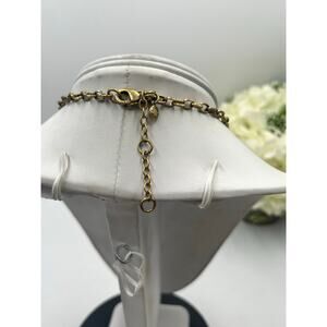 Design: The necklace is composed of large hexagonal metal plates linked together, with smaller, rounded green stones set into the gold-tone sections.