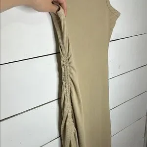 Great condition, no rips or stains. Fitted ribbed material midi dress. Ruching on one side with tie strings and a slit. Stock photos included to show fit.