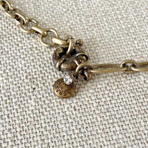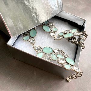 Beautiful statement necklace from J. Crew in shades of aqua and clear crystal stones on an antique gold link chain. Some tarnish on clasp. Signature J. Crew ring clasp with CZ charm. Adjustable length from 17" - 20". Original J. Crew gift box included.