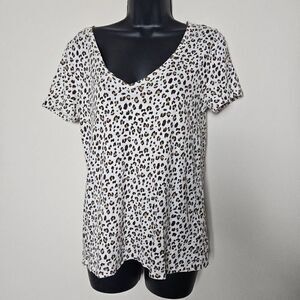 This is a short sleeved t-shirt by J. Crew. It is white with black and tan animal print.