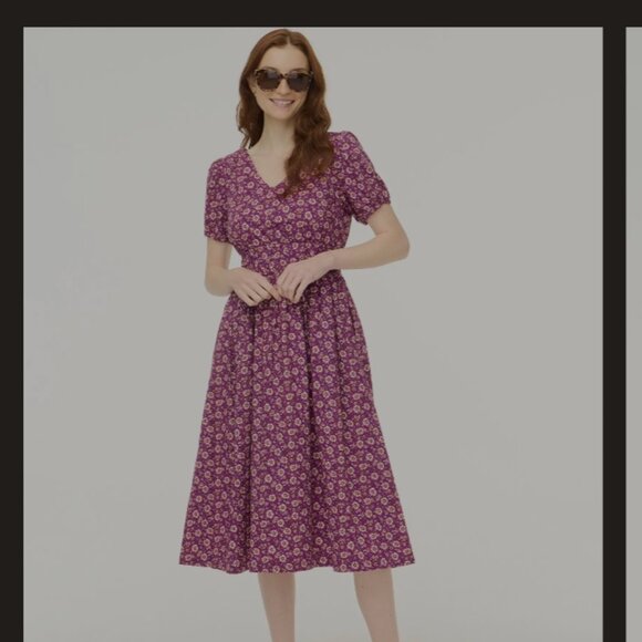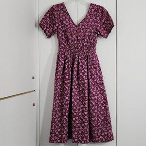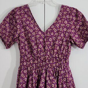 Elegant violet cotton dress with floral design. Short sleeves and flowing fit. Perfect for any occasion.