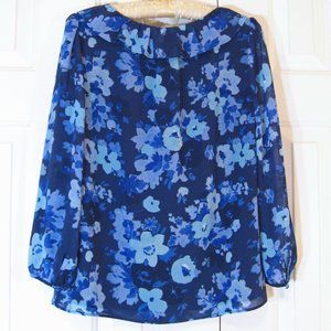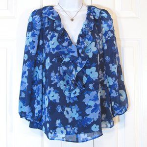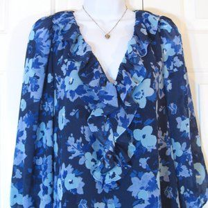 This beautiful watercolor 'Begonias' floral print popover style blouse features a feminine V-neck ruffle front neckline and sheer flowy 3/4 length sleeves. The body of the blouse is lined for coverage. This classic, versatile silhouette is the perfect addition to your wardrobe. In excellent preowned condition!