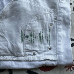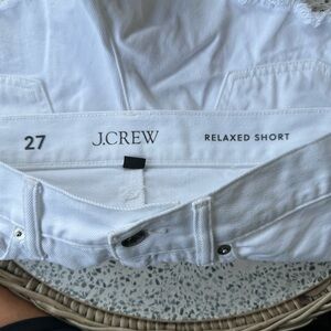 These white jean shorts by J. Crew showcase a trendy distressed cut-off hem, perfect for a laid-back summer vibe. Crafted from medium-weight denim, they offer a bright, fresh look with a casual, worn-in aesthetic.