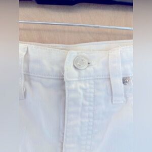 Chic white jean shorts with frayed hem. Perfect for casual style. Comfortable and trendy. Newly washed and brightened. Very cute as a late summer staple!