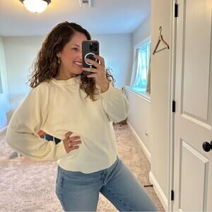 I love this super cute J. Crew white neutral cotton cashmere crewneck balloon sleeve sweater/pullover/jumper