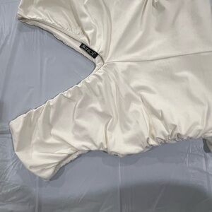 Elegant white top with ruched detailing. Short sleeves. V-neck design.