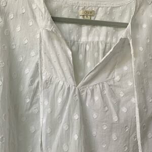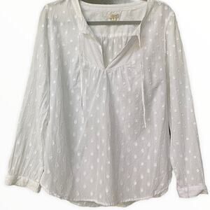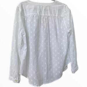 Long-sleeve white peasant blouse with Swiss dot detailing.