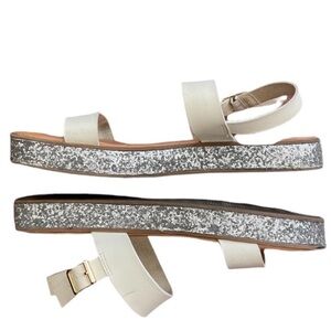 •Cream white straps, tan footbed and silver sole glitter platform sides