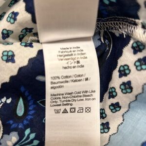 This J. Crew blouse features a relaxed fit with elegant ruffled accents and a distinctive bib collar. The white and blue color scheme adds a fresh touch, while the 3/4 sleeves provide a versatile style. Crafted from a soft, flowy fabric, it ensures comfort and effortless elegance.