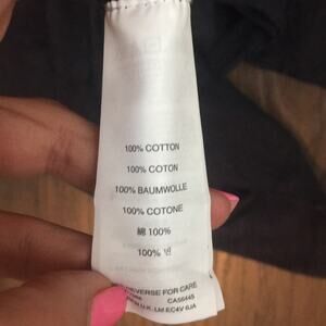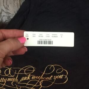 Size S. 100% Cotton. Length 24 inches. Armpit to armpit 19 1/2 inches. Light weight. My life would pretty much suck without you. Colors charcoal gray and gold. Great condition!