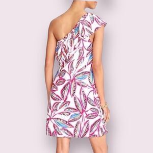This is a new J.CREW dress made of lightweight woven fabric with a graphic floral pattern in white, pink, and blue colors. The dress has a one-shoulder ruffle neckline of elastic and pullover closure. It is knee-length with a slight a line shape. Relaxed fit The dress is lined and made of a linen blend. It is available in size XS Can also go up a size to a small.