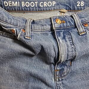 J. Crew womans size 28 9" Billie Demi Boot Crop distressed denim jeans medium wash mid-rise 5 pocket design zipper and button closure crop length with a kick boot cut great preowned condition