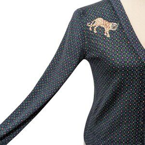 Good condition, minor signs of wear, gently used, no rips, holes or tears, pretty blue/green floral geometric print w/embroidered tigers on shoulders, button front, long sleeves, 100% merino wool