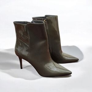This is a J.CREW women's ankle boot in size 8.5. The boot is khaki green in color and made of patent leather. It features a high-heel style and is categorized as a bootie.