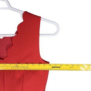 This vibrant coral dress tells a story of elegance and playful design. The scalloped neckline and hem add a charming detail, while the sleeveless silhouette keeps it modern and versatile. A perfect piece to embody both sophistication and whimsy, it’s ready to make memories wherever it goes.