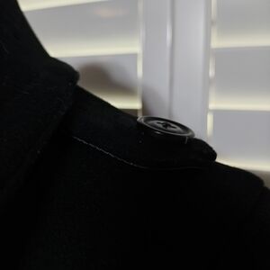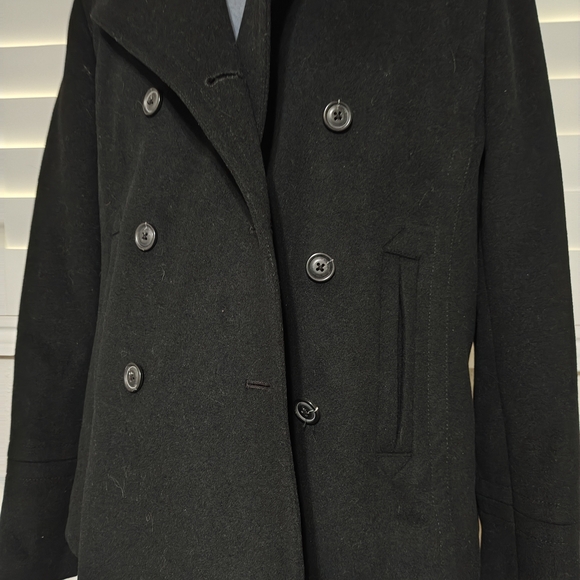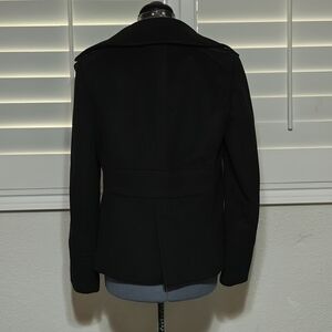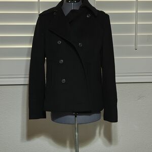 Elegant black peacoat with double-breasted design. Features classic button detailing. Ideal for chic layering. Missing size tag so selling at lower price.