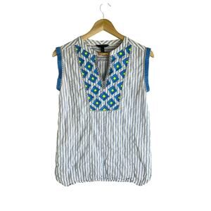 J. Crew Women's Blue Sleeveless Boho Sunburst Embroidered Crinkle Casual Blouse Size 0