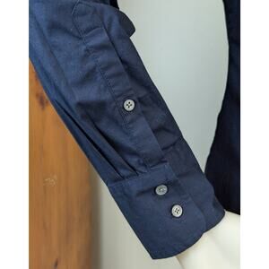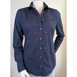 This women's J.Crew size 8 slim fit button down shirt features a navy blue base with playful embroidered 3D red cherry pom poms that are highlighted with green sequin leaves. It has a collared neckline, shirttail silhouette, full button front, and long sleeves with button cuffs. The tailored fit and classic design make it versatile for casual wear, work outfits, or layering in the cooler months. The fabric is a lightweight stretch cotton yet structured, creating a polished silhouette. It is in excellent condition without notable flaws. Approximate measurements are below. 2 day shipping!