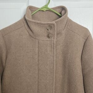 Chic camel coat by J Crew. Features a sleek design with button details. Ideal for layering in cooler weather. in great condition. 33" long from shoulder to bottom of coat.