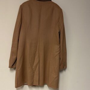 Elegant camel three button wool blend coat by J. Crew. Features classic button closure and sleek design. Ideal for versatile styling.