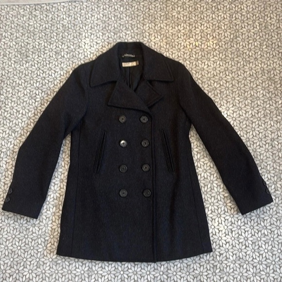 Timeless black peacoat with double-breasted design. Features wide lapels and button accents.