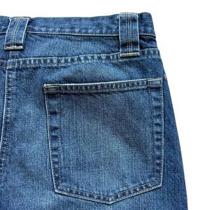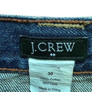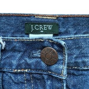 Keywords: J. Crew, mini skirt, denim, blue skirt, raw edge hem, casual wear, women's fashion, cotton, pockets, button closure, low-rise, short skirt, versatile, pre-owned, chic style.