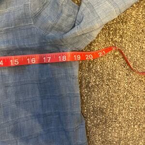 Long-sleeve lightweight chambray tunic with open neck and ties. Light blue with navy embroidery. Size women’s 0.
