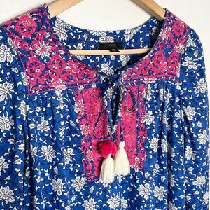 J. Crew Womens Embroidered Peasant Top XS Blue Pink V Neck Tasseled Cotton
