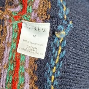 Stay cozy and stylish with this J. Crew Fair Isle Crewneck Sweater! Made from 100% wool, this sweater features a colorful, classic Fair Isle pattern on a navy blue background. Perfect for adding a pop of color to your winter wardrobe and keeping you warm all season long.