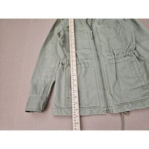 This J. Crew women's jacket is a must-have for any fashion-forward woman. The jacket features a solid army green color, a hooded design, and a long zip and button closure. The jacket is made of high-quality cotton material, ensuring both comfort and durability.
