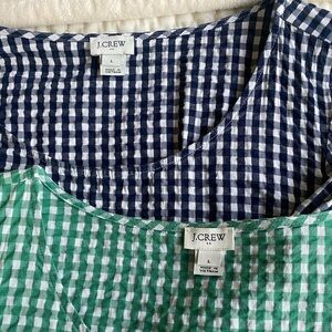 Chic gingham blouses by J. Crew. Features navy and green patterns. Perfect for casual outings.