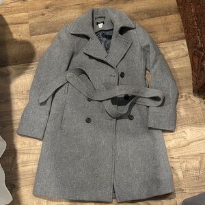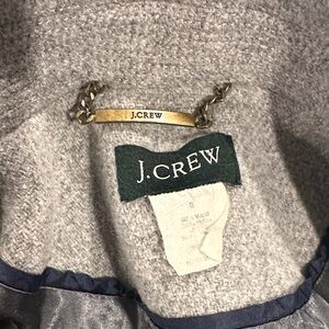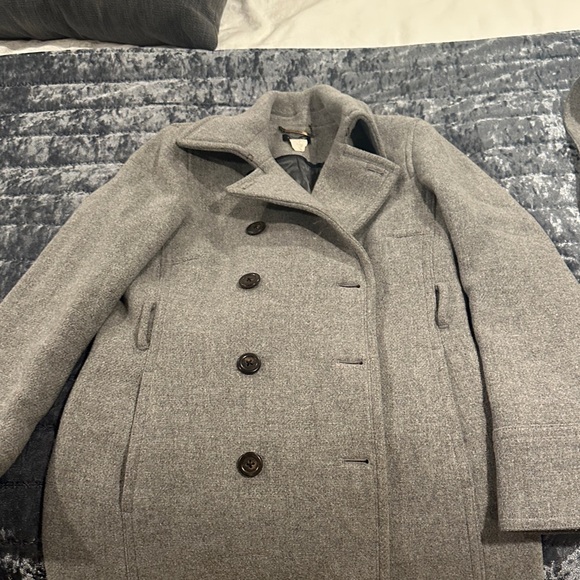Elegant gray pea coat by J. Crew. Features classic button design. Ideal for cool weather.