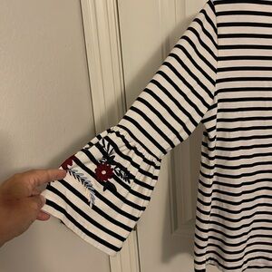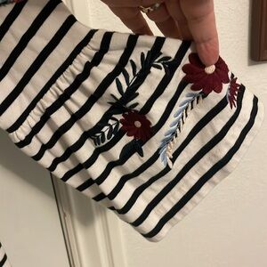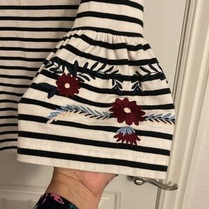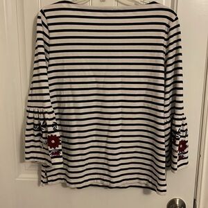 J.Crew women’s size medium top white with black, horizontal stripes & heavily embroidered on top front and bell sleeves ends and burgundy, creams, and blues.