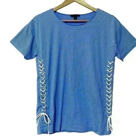 J. Crew Women’s Medium Blue Striped 100% Cotton Short Sleeve Lace Up Tee