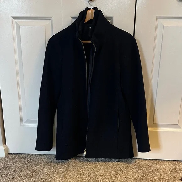 Tailored navy blue wool jacket-Full zip collar -ribbed village coat. Stand collar adds refined structure. Smooth zip-front closure for a clean look. Subtle side pockets for function. Versatile for city and office wear.