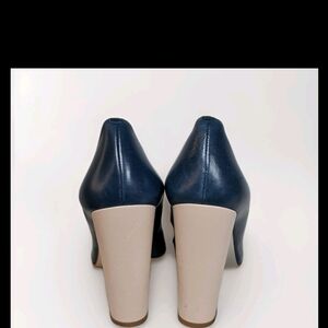 The J.Crew Etta Cap Toe Navy Blue & Beige heels in size 7 are a stylish option for women looking for a high block heel pump with a round toe shape. Made with leather upper material, these shoes feature a navy blue color with a beige cap toe, adding a unique touch to the design. The J.Crew brand ensures quality and a classic style that can be worn for various occasions. The high heel height makes these shoes a fashionable and comfortable choice for any woman's wardrobe.