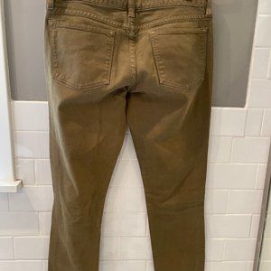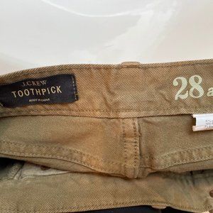 Classic J. Crew toothpick ankle-length jeans in a neutral olive color. Material feels like a cross between twill and denim and does not stretch much. Size 28, fits more like a 27. Gently used.