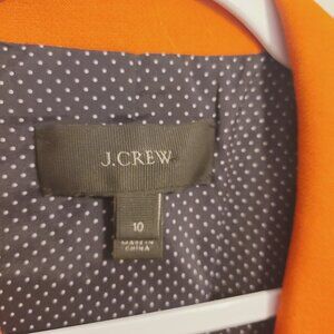 Women's orange one-button wool blend blazer by J. Crew, size 10. Lined in black with white polka dots. Front pockets. Three buttons on sleeves/wrists. Style G7725. Wool, polyester, and viscose fabric blend. Hidden inside pocket. Slight shoulder pads and split in back. Designed to hit at low hip. Excellent pre-owned condition; no flaws.