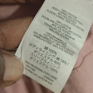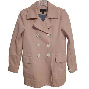 Women's pale pink, double breast pea coat/jacket by J. Crew, size 00. Heavyweight cotton twill jacket feels like denim. White buttons down front, at wrists and in back. Has a pea coat silhouette. Jacket has some blue lining and two front pockets. Outside of jacket is 100% cotton; lining is a polyester and cotton blend. Excellent pre-owned condition; no flaws. Stock pic of same coat in navy included to show possible fit.