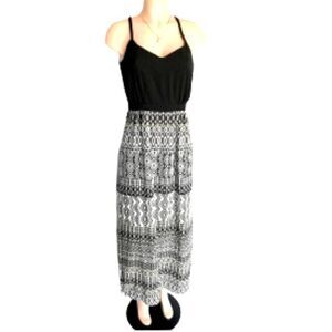 Chic and effortless, this black and white printed maxi dress features a flattering racerback design, a stylish side slit, and a modern silhouette. Perfect for warm weather events or casual-chic days.