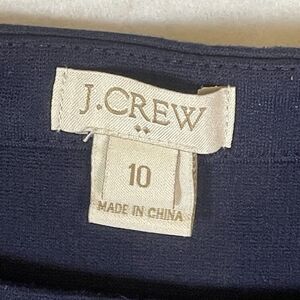J Crew Womens Size 10 Navy Blue White Trim Work Dress Minimalist Fitted Stretch. Classic fitted sheath dress. Basic design with white trim edges - this never goes out of style. Side zip to help with putting on and a round neck. Clean pre-owned condition with no significant wear. Review photos carefully for measurements and all other details.
