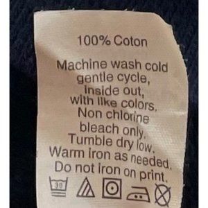 Machine wash cold. Gentle cycle inside out with like colors. Tumble dry low. Warm iron. Do not iron on print!