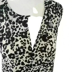 J Crew Women’s Blouse. Size 0. Oversized fit This black and white blouse is sleeveless with a scoop neck. The neck has a keyhole opening that can be buttoned or left open for two different looks. The print is black and white leopard like. Super cute. Measurements Chest across 17” Length 26” Blouse is in perfect condition. No flaws at all!