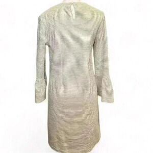 Keywords: J. Crew, shift dress, knee-length, gray, striped, casual, spring, ruffle sleeves, cotton, women's fashion, pre-owned.