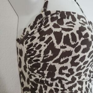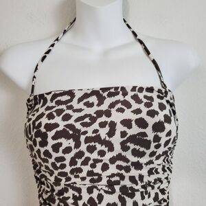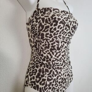 J Crew women's one piece swimsuit in Leopard print - bandeau style top, side ruched, built in bra with side boning, removable pads, halter removable strap and lined. Brown and white.
