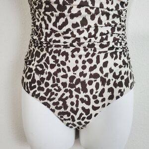 J Crew Women's Swimsuit 2 White Brown Ruched Bandeau One Piece in Leopard Print